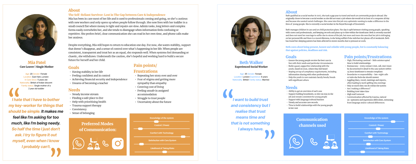 A persona is a profile that represents a group of people, in this case users of the service, stakeholders. They are fictional people created by data collated from interviews, surveys and obversations. They help make the data more easily understandable and help share research findings. Shared needs and behaviour patterns conveyed. I had cretated personas before with my time creating ads for Peugeot at the beginning of my career. Personas help create a specific image for a certain group. We had to be careful to avoid stereotypes. Key to these personas was a pull out quote taken directly from the data collected and where possible where more than one participant had a similar line or in Mia's case, a combination of three very relevant statements.